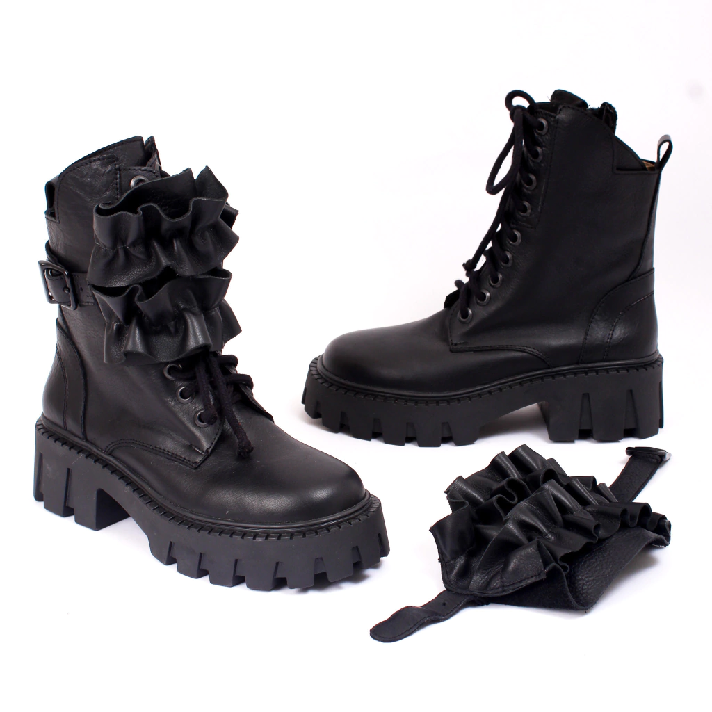 Borcego caña media confeccionado íntegramente en cuero vacuno color negro, detalle de aplique desmontable en cuero con hebilla, cierre en el lateral interno, y cordones a tono.