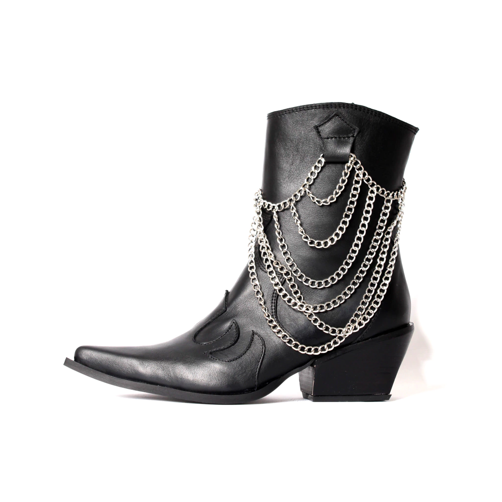 Bota de caña media tipo texana con punta súper fina confeccionada íntegramente en cuero vacuno con cierre en el lateral interno y detalle de diseño en cadena.