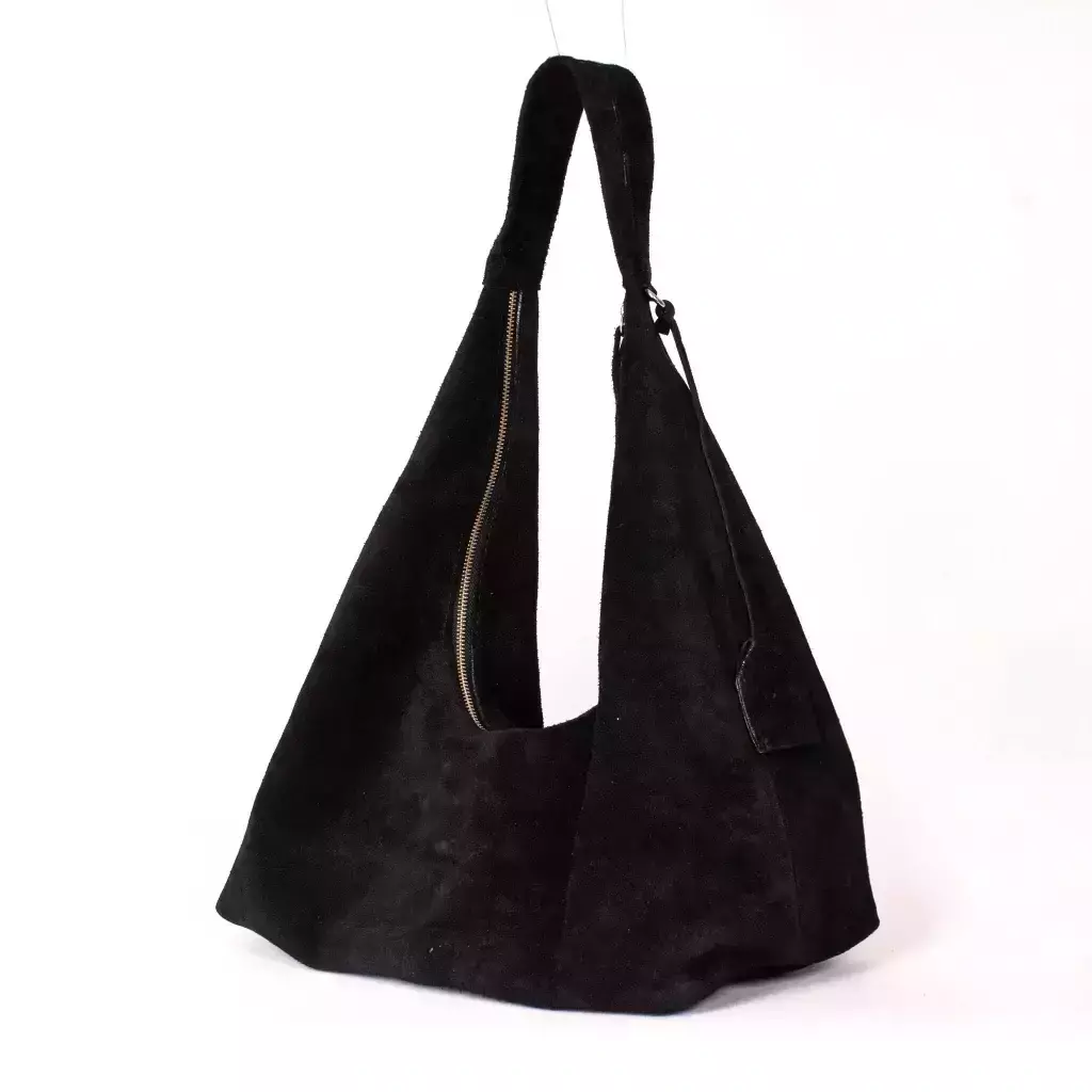 Cartera confeccionada íntegramente en cuero vacuno gamuzado color negro, con bolsa interna desmontable.