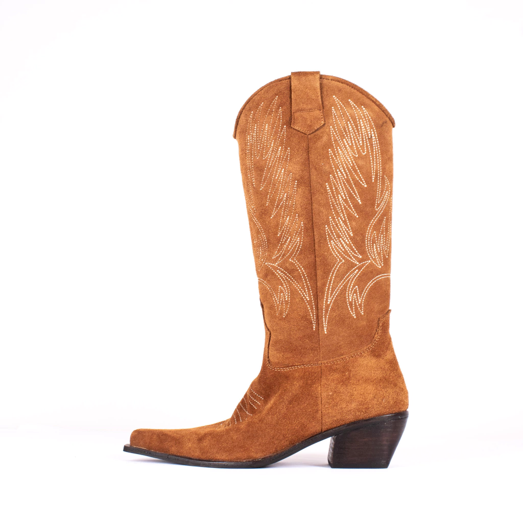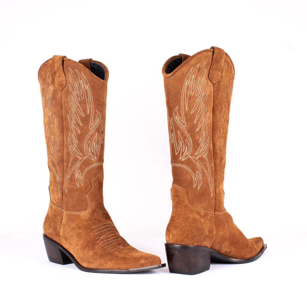 Bota de caña alta tipo texana con punta fina confeccionada íntegramente en cuero gamuzado color suela, cuenta con un diseño exclusivo con bordado.