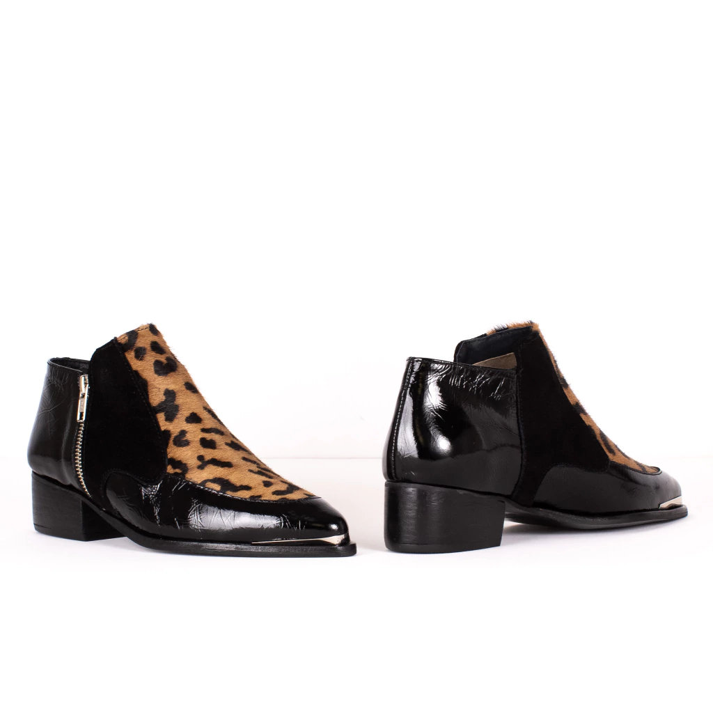 Bota de caña baja confeccionada íntegramente en cuero vacuno combinando cuero charolado, cuero gamuzado y cuero tipo pelo en color print suela y negro, con cierre en el lateral interno y puntera de metal.