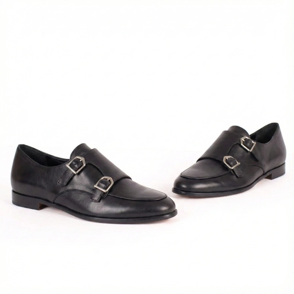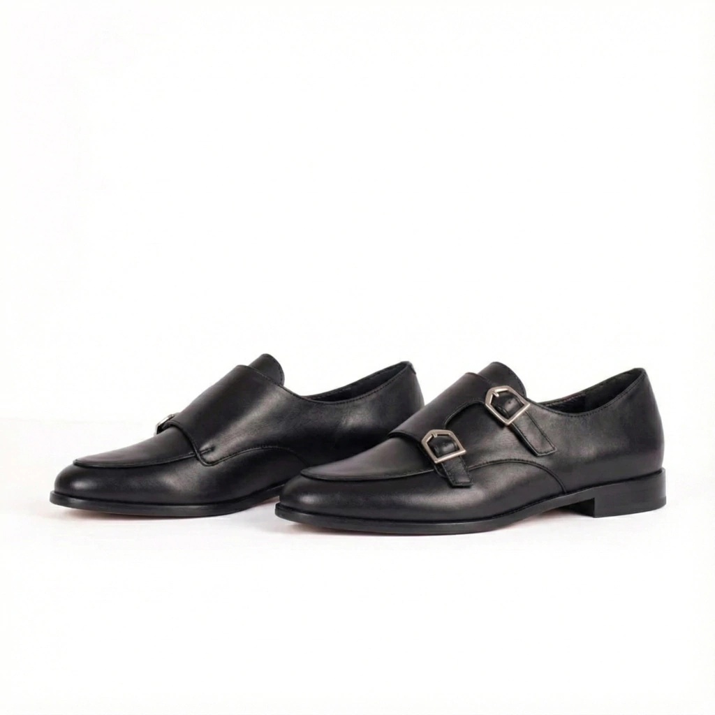 Mocasín confeccionado íntegramente en cuero vacuno color negro, con forrería en cuero, plantilla acolchada y detalle de hebillas color niquel regulables en la capellada.