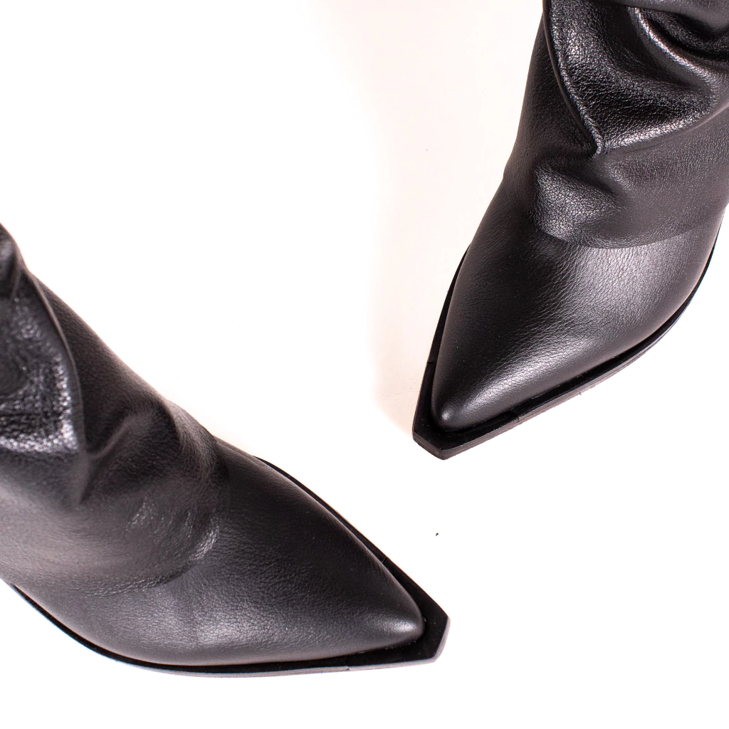Bota de caña alta estilo texana confeccionada íntegramente en cuero vacuno color negro, forrería de cuero, plantilla acolchada y detalle de cuello volcado.