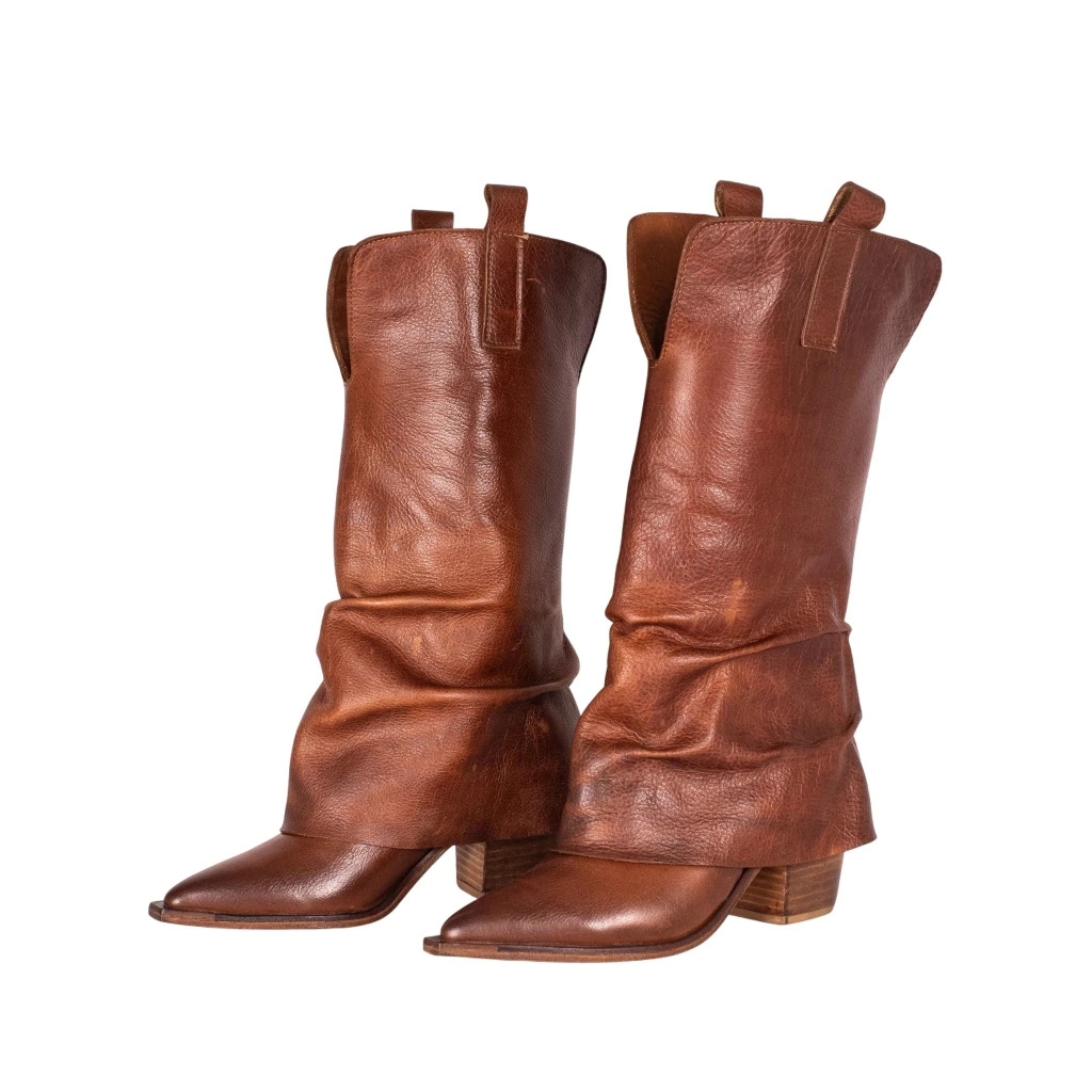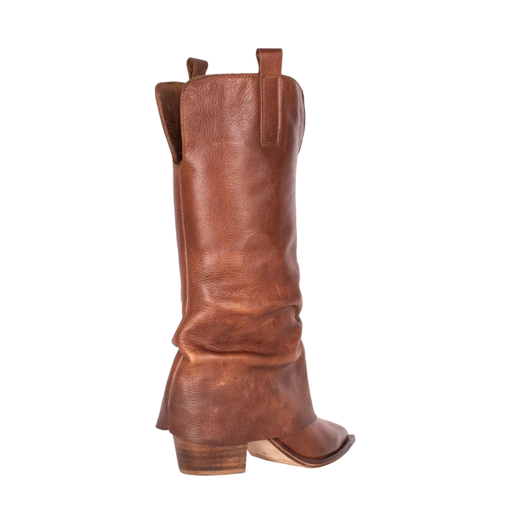 Bota de caña alta estilo texana confeccionada íntegramente en cuero color suela con forrería en cuero y detalle de cuello volcado.