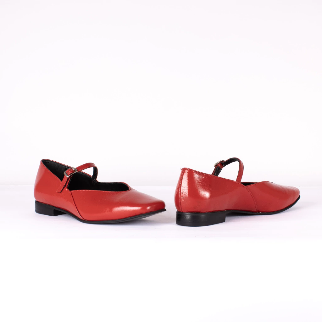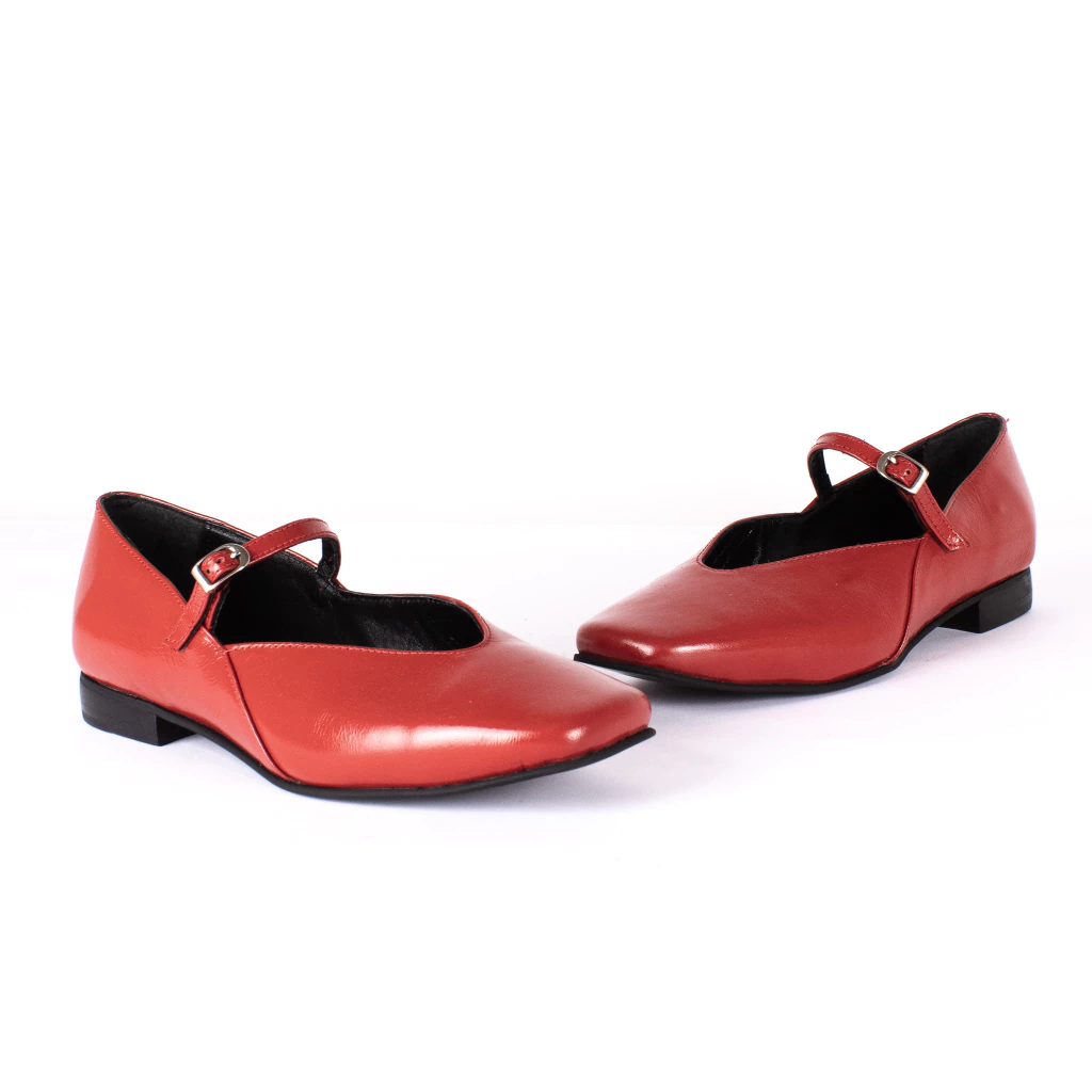 Zapatos tipo mary jane confeccionados íntegramente en cuero charolado color rojo, de punta cuadrada y escote en "v" con detalle de tira en capellada.