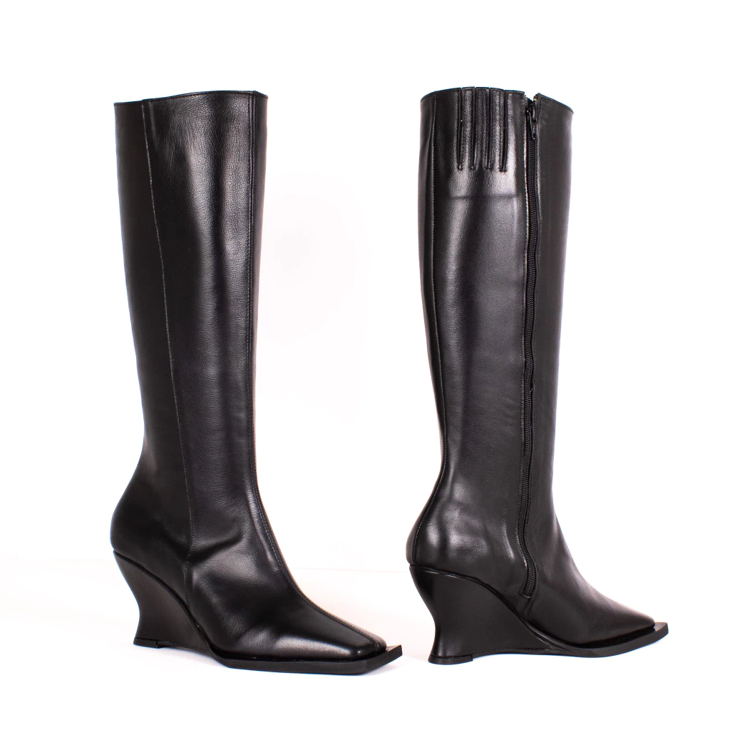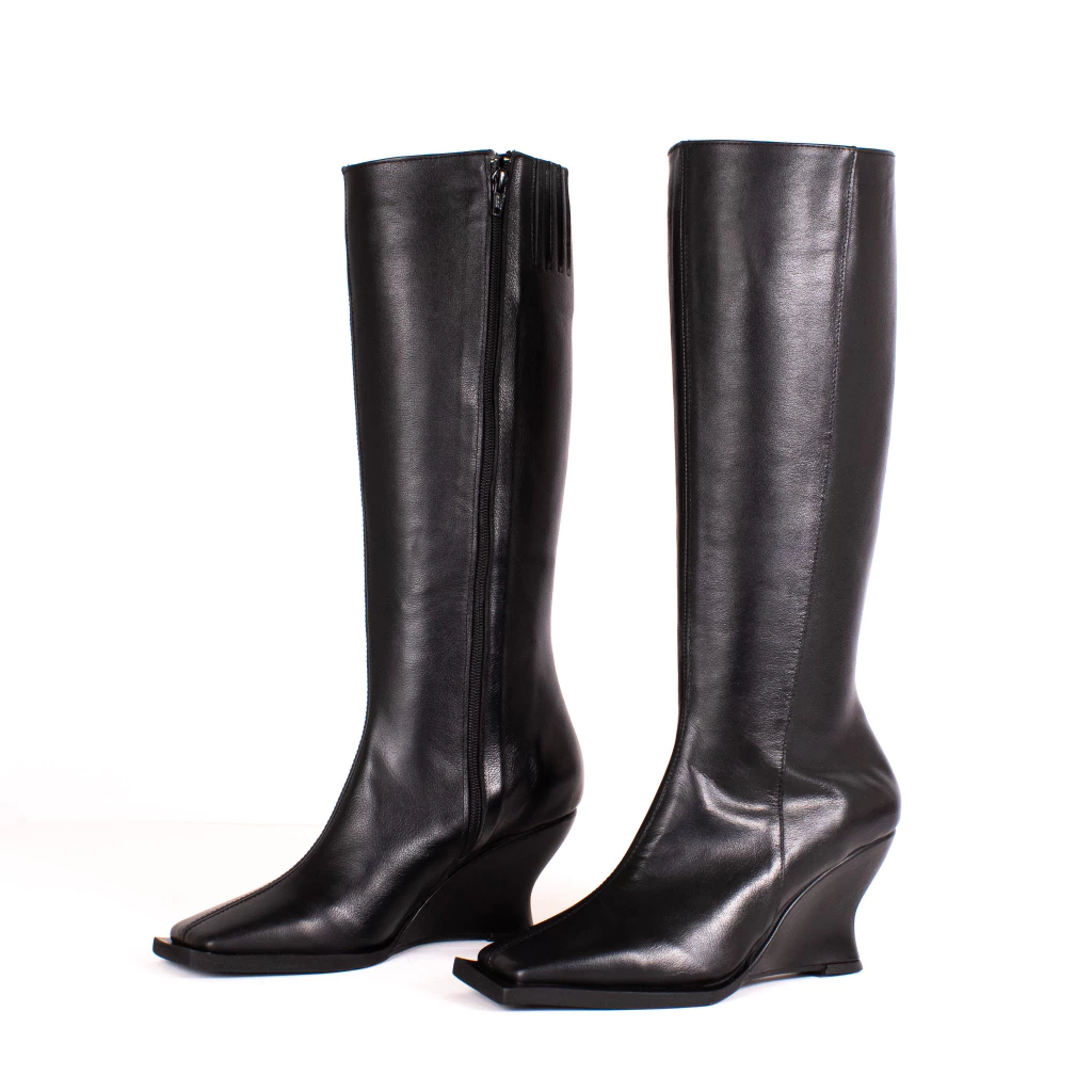 Bota de caña alta confeccionada íntegramente en cuero vacuno color negro, forrería en cuero, plantilla acolchada, con cierre en el lateral interno detalle de punta cuadrada y taco chino.