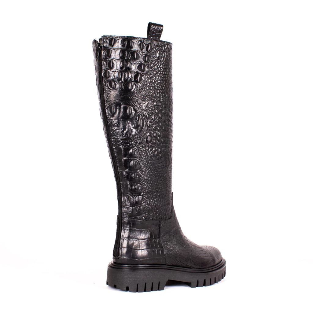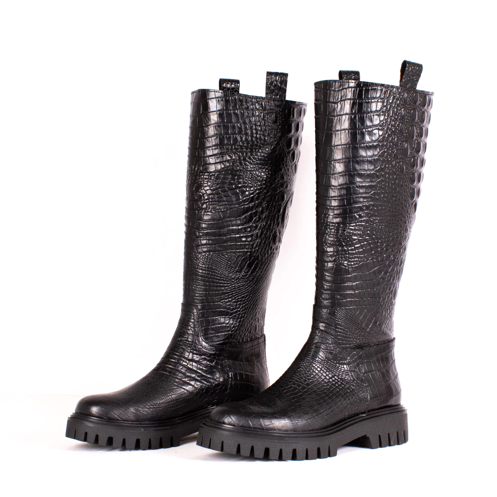 Bota tipo de montar confeccionada íntegramente en cuero vacuno tipo croco color negro, forrería en cuero, plantilla acolchada, cierre en la parte posterior de pierna y detalle de base de ruta súper liviana.