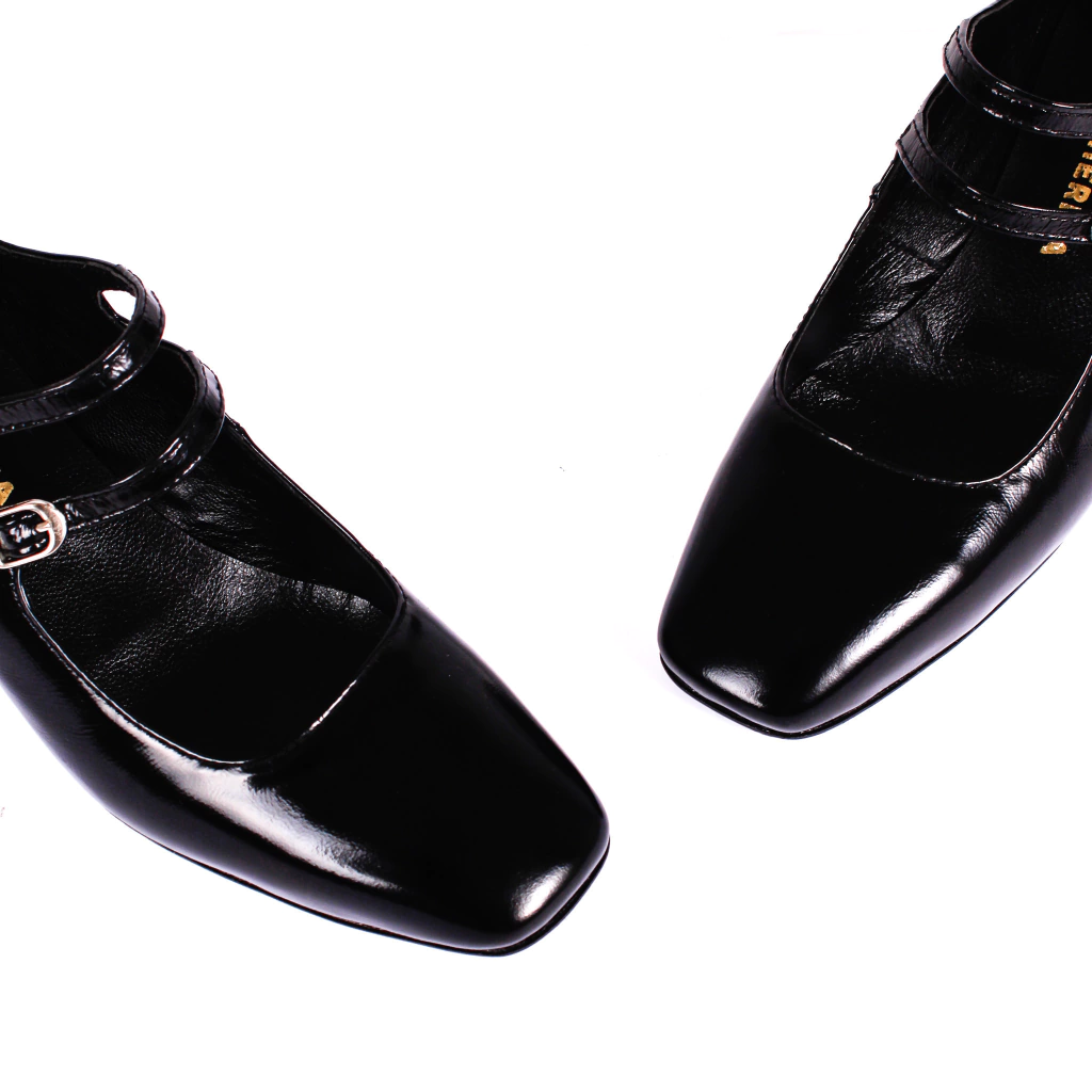 Zapatos tipo Mary Jane confeccionados íntegramente en cuero charolado color negro, con hebillas color niquel.