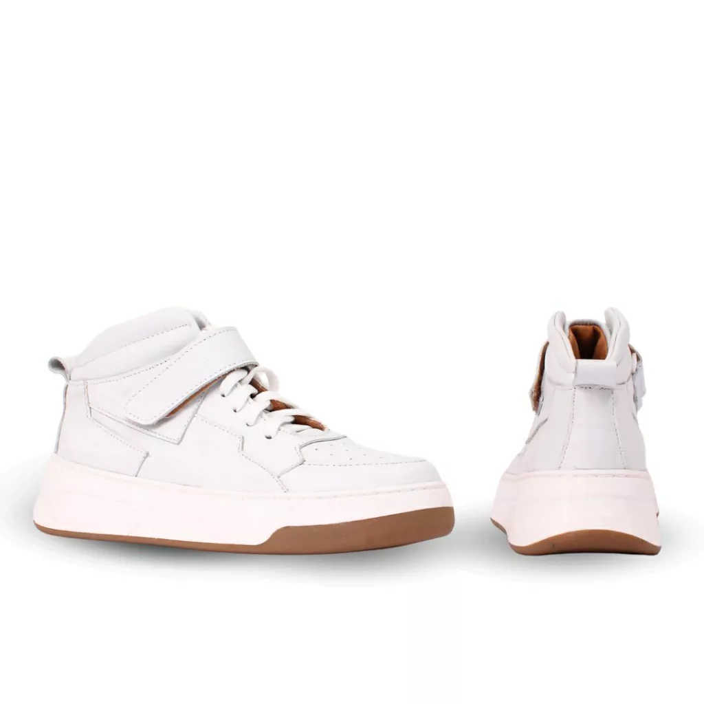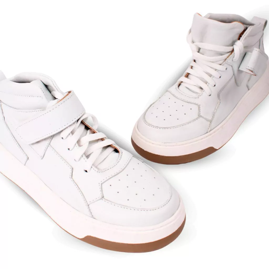 Zapatilla confeccionada íntegramente en cuero vacuno color blanco con forreria en cuero y detalle de cordones a tono.