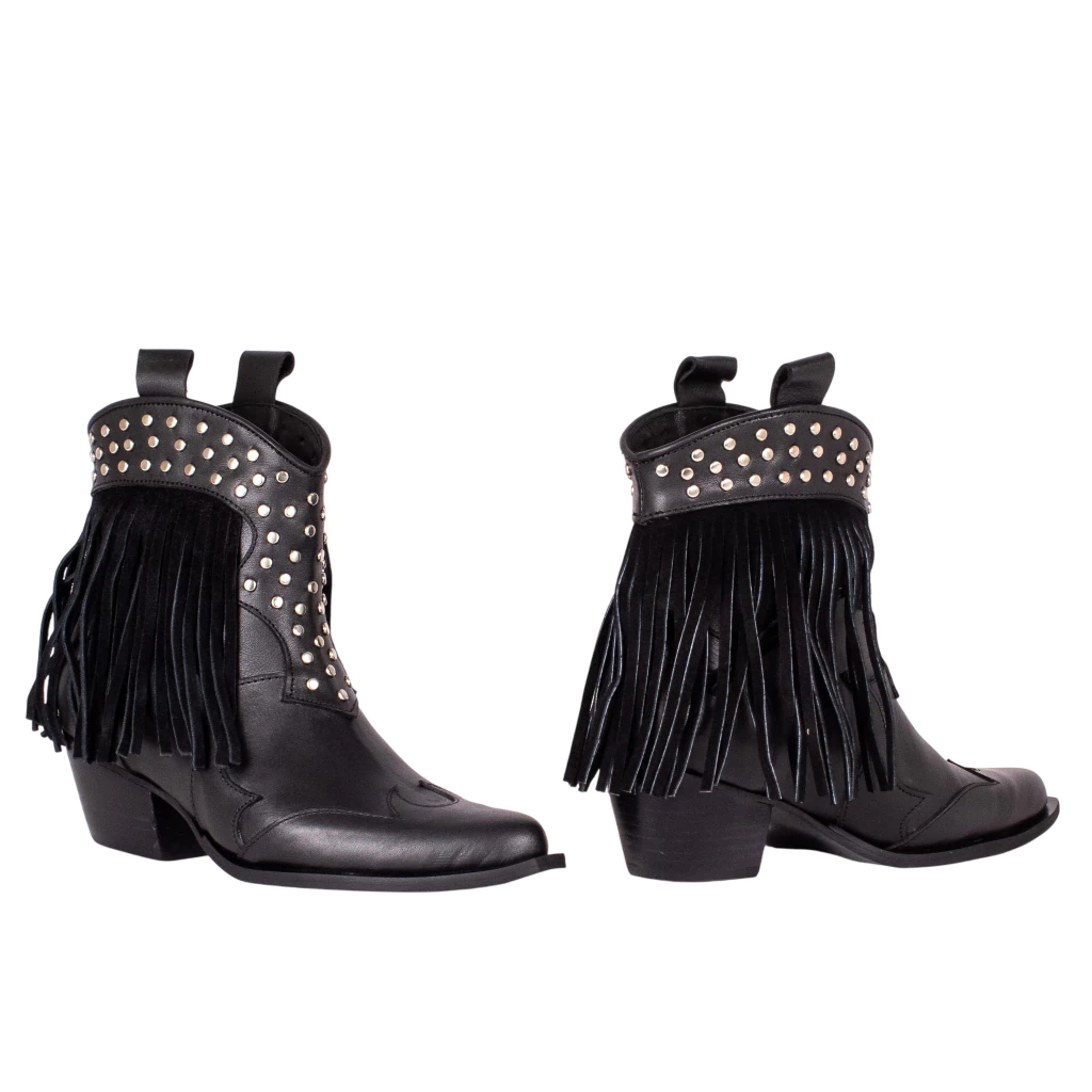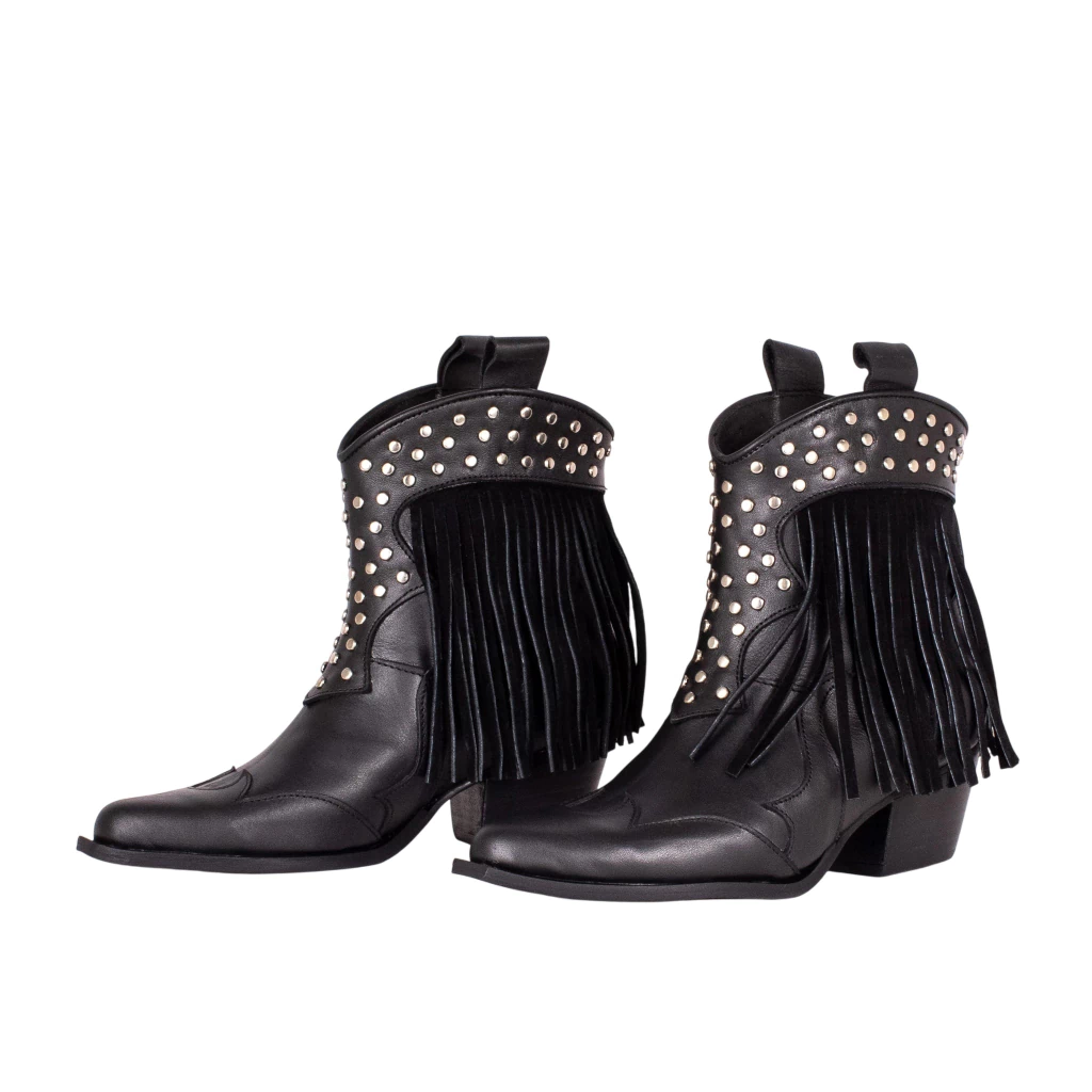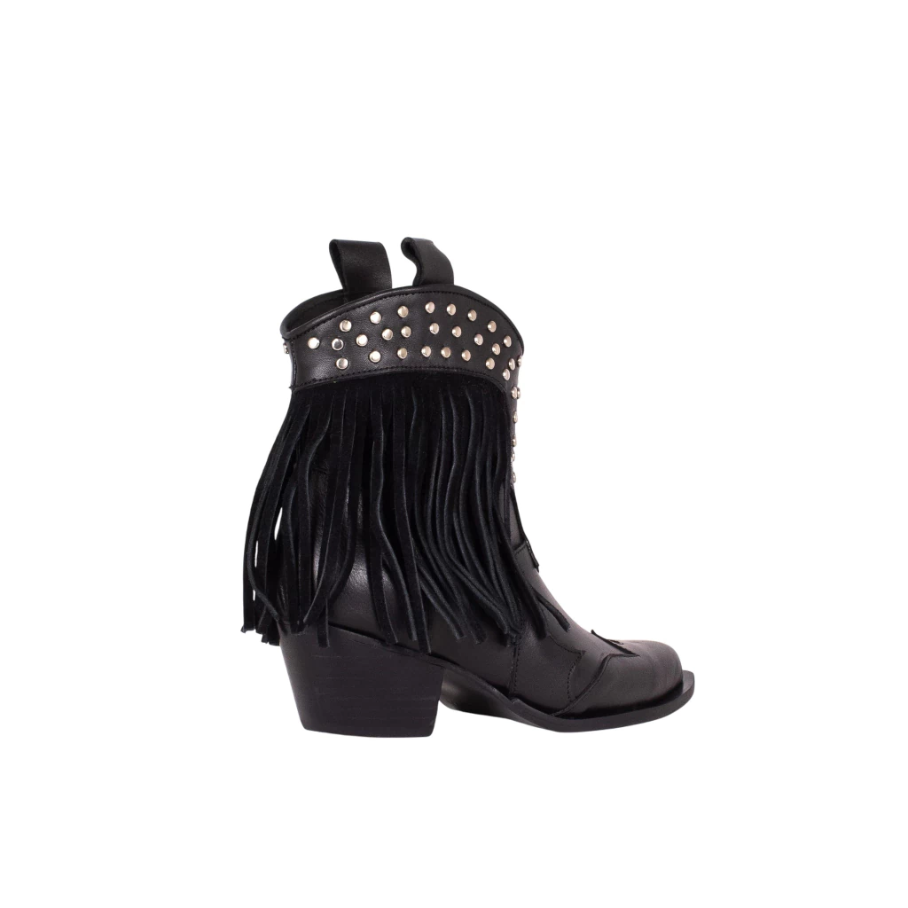 Bota de caña media tipo texana con punta fina confeccionada íntegramente en cuero vacuno negro, cuenta con un diseño de flecos de cuero gamuzado y tachas alrededor de la caña y en capellada.