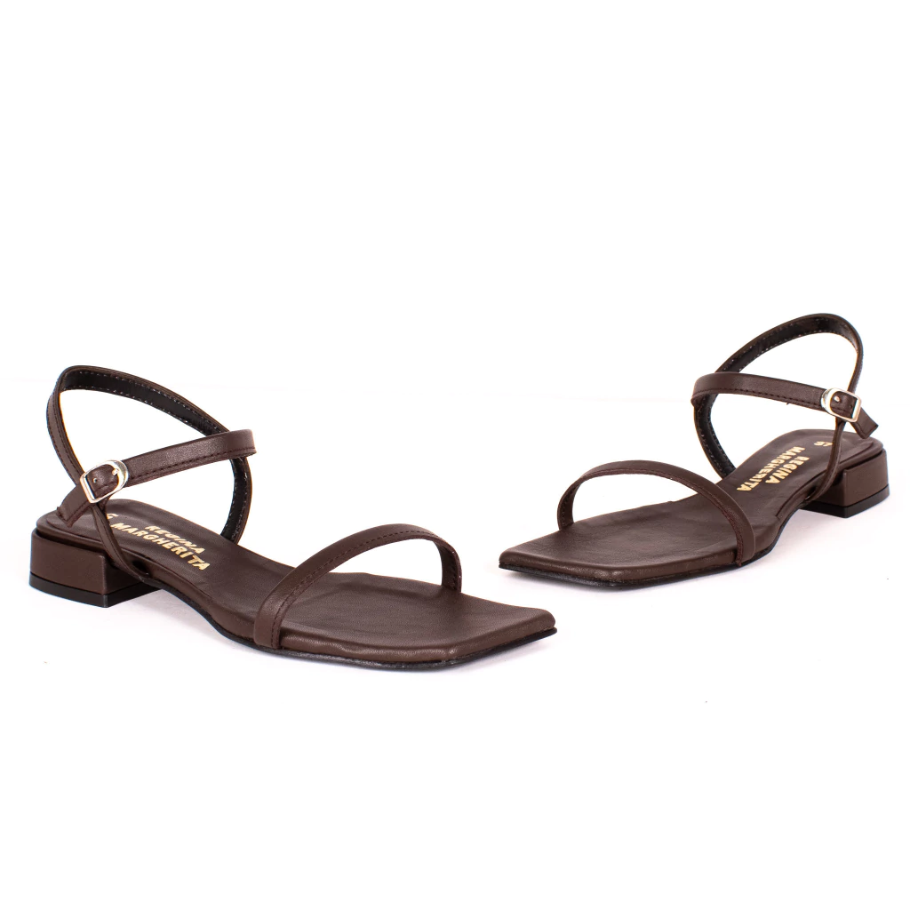 Sandalia confeccionada íntegramente en cuero vacuno color marrón, plantilla acolchada, forrería de cuero, con tiras finitas y agarre regulable en tobillo con hebilla.