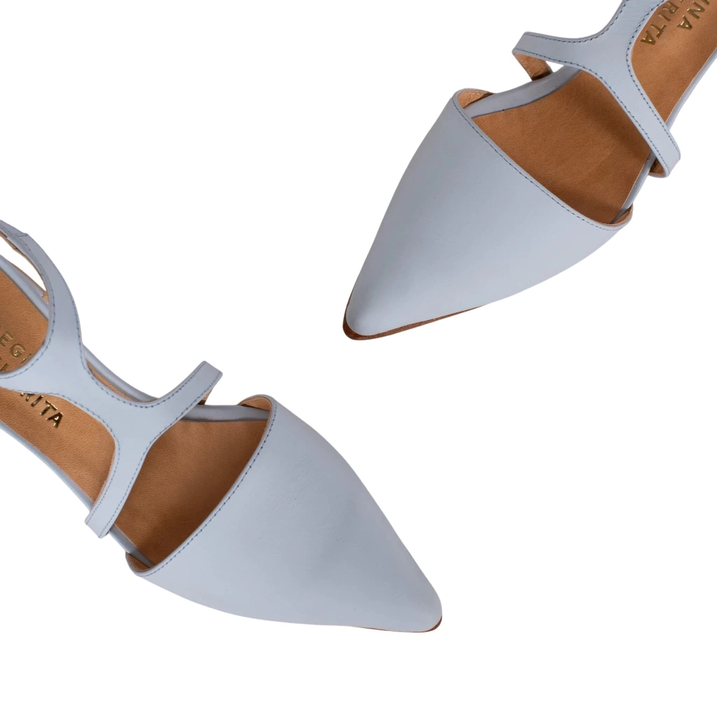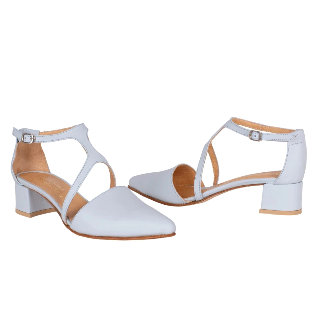 Stiletto en punta estilo kitten heels confeccionado íntegramente en cuero color celeste, forrería en cuero, plantilla acolchada, con tiras cruzadas, con pulsera y detalle de hebilla color niquel.