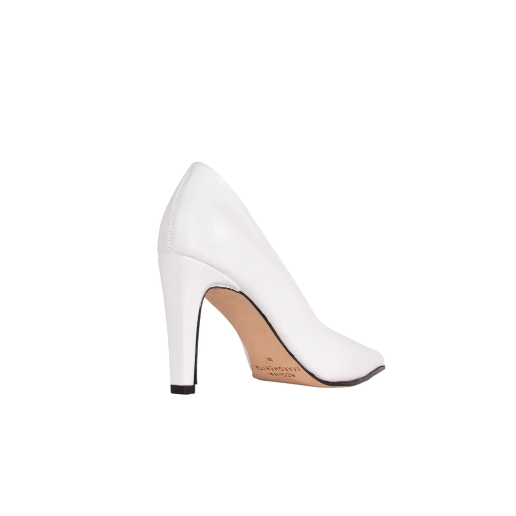 Zapato tipo stiletto confeccionado íntegramente en cuero color blanco, detalle de escote en forma de V en capellada.