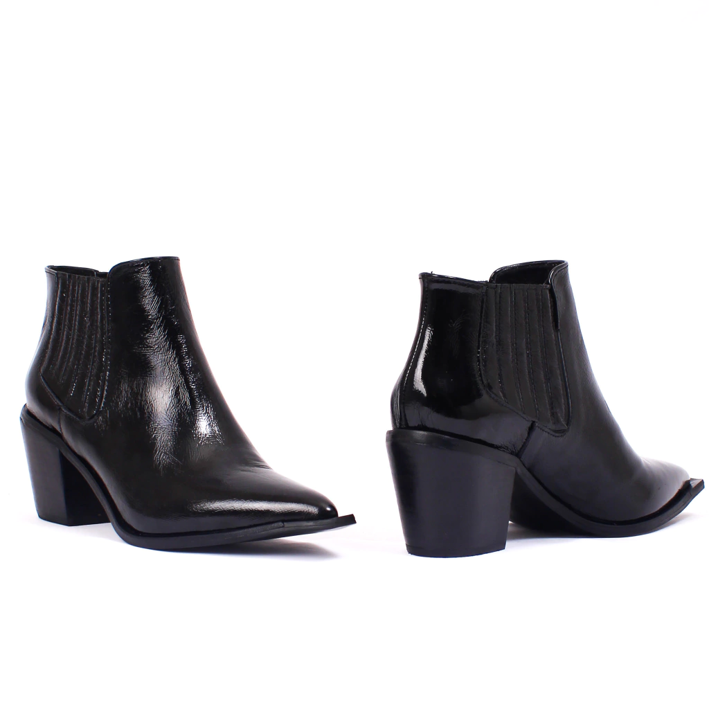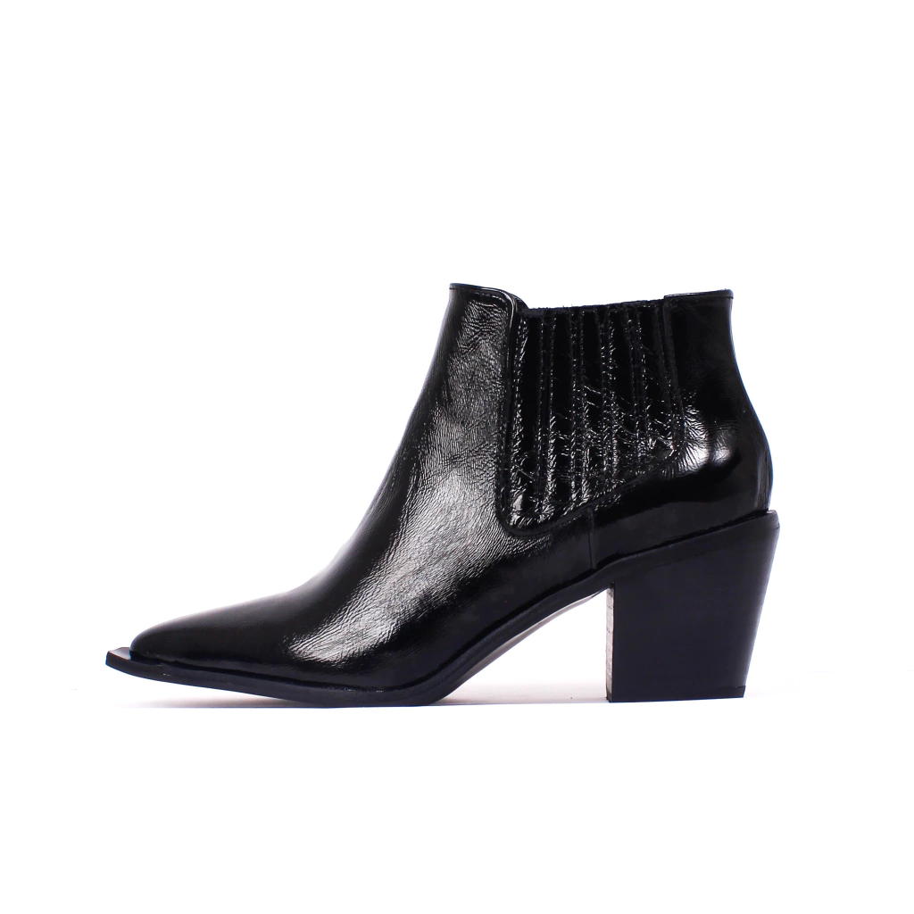 Bota de caña baja tipo texana en punta fina confeccionada íntegramente en cuero charol quebrado, con elastico en ambos costados