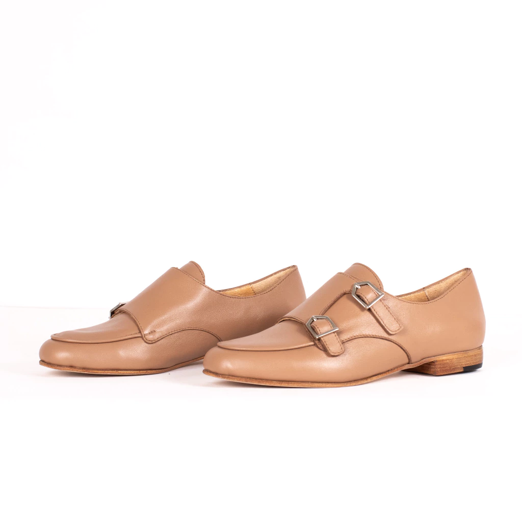 Mocasín confeccionado íntegramente en cuero vacuno color moka con detalle de hebillas en capellada.
