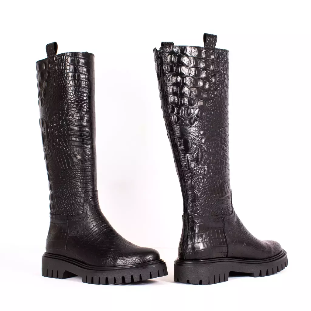 Bota tipo de montar confeccionada íntegramente en cuero vacuno tipo croco color negro, forrería en cuero, cierre en la parte posterior de pierna y detalle de base de ruta súper liviana.