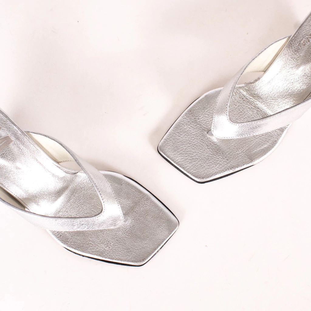 Ojota confeccionada íntegramente en cuero metalizado color plata, forreria en cuero, plantilla acolchada, detalle de taco chino.